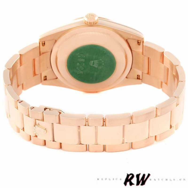 Rolex President Day Date 118205 Rose Gold Black Dial 36mm Mens Watch.Rose gold oyster case 36.0 mm in diameter.Rose gold smooth domed bezel. Scratch resistant sapphire crystal with Cyclops magnifier. Black dial with raised rose gold Arabic numeral hour markers. Date calendar at 3 o'clock aperture. Day window at 12.Rose gold oyster bracelet with hidden clasp. Fits 7 1/4" wrist.