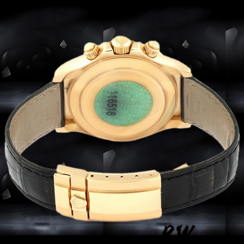 Rolex Cosmograph Daytona 116518 Champagne Dial Yellow Gold Bezel 40mm Mens Watch.40mm Yellow Gold Case.Sapphire Crystal. Champagne Dial with Luminous Hour Markers,Yellow Gold Engraved Tachymeter Fixed Bezel , Black Leather Strap with Deployment Buckle.The minute mark around the outer edge of the glass is a design element that represents time.