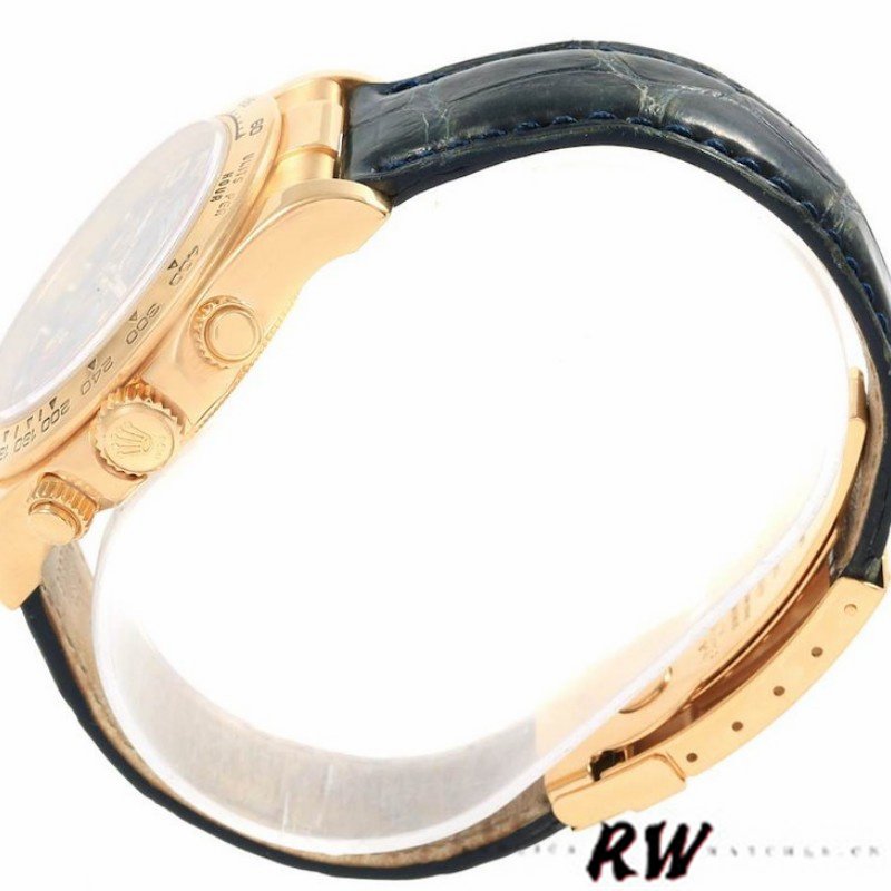 Rolex Cosmograph Daytona 116518 Leather strap Blue Dial 40mm Mens Watch features an easy-to-wear 40mm yellow gold case paired with a matte cobalt blue dial with red chronograph hands and exceptionally lumed yellow gold Arabic numerals.Special screw-down push buttons. Yellow gold tachymeter engraved bezel. Scratch resistant sapphire crystal. Blue dial with arabic numerals. Small seconds hand at 6 o'clock. Centre chronograph hand, 30-minute counter at 3 o'clock and 12-hour counter at 9 o'clock. Brown leather strap with yellow gold deployant buckle.