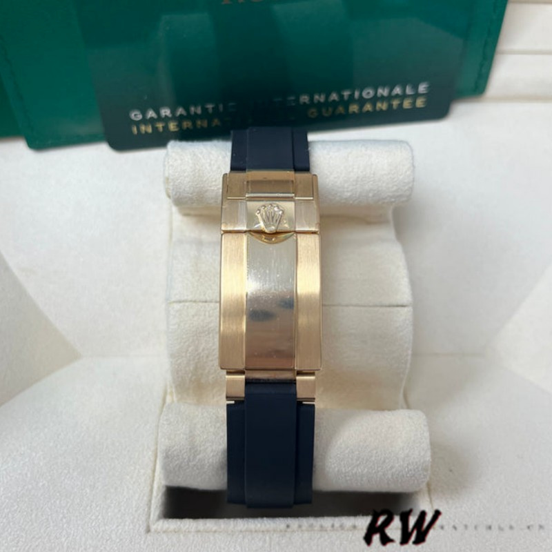 Rolex Cosmograph Daytona 116518LN Meteorite and Black Index Dial 40mm Mens Watch.40mm yellow gold case, screw-down yellow gold back, screw-down crown and push buttons with Triplock triple waterproofness, black monobloc Cerachrom bezel with engraved tachymetric scale, scratch-resistant double anti-reflective sapphire crystal, meteorite dial, black subdials, index hour markers, Chronograph central second hand, 30-minute counter at 3 o'clock, and 12-hour counter at 9 o'clock, black Rubber strap made from flexible metal blades overmoulded with high-performance elastomer,Folding safety buckle with rapid extension system.