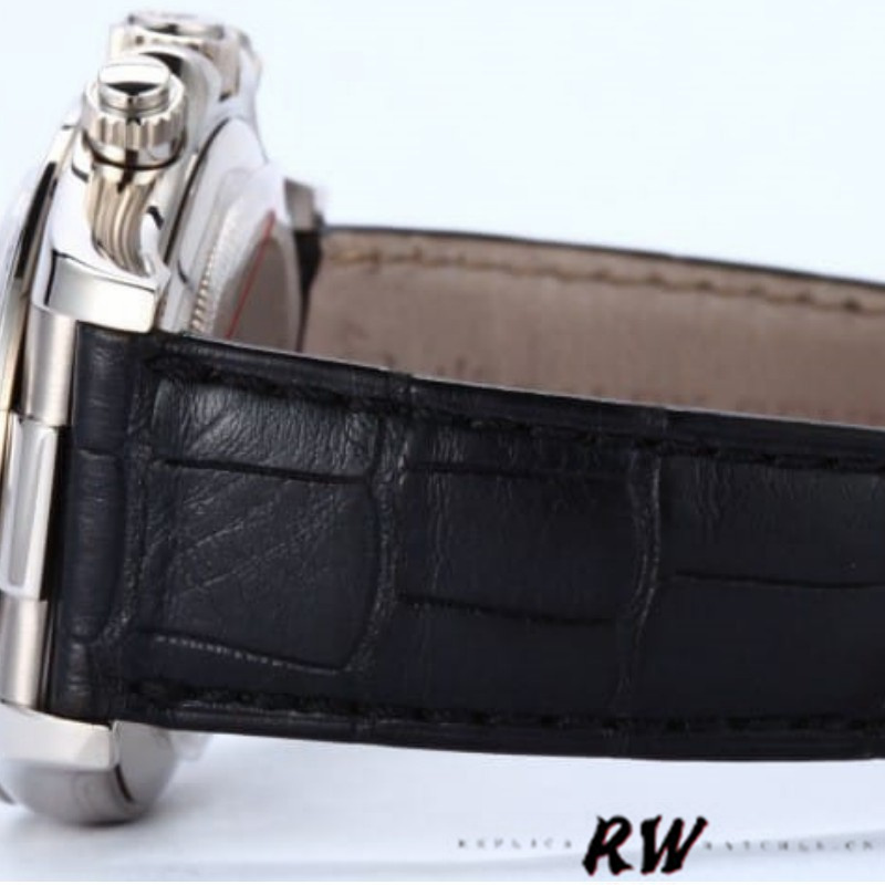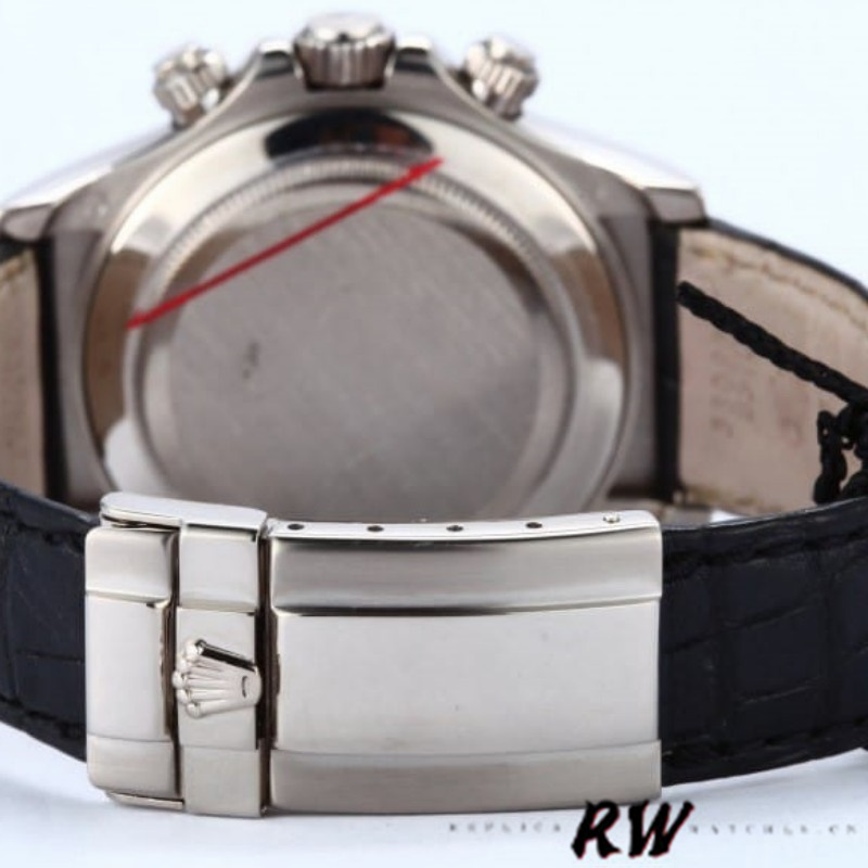 Rolex Cosmograph Daytona 116519 Gray dial Black Leather Strap 40mm Mens Watch. The 40mm white gold case Rolex watch has a Triplock winding crown and two screw-down chronograph pushbuttons.Fixed domed tachymeter bezel and a scratch-resistant sapphire crystal.For the fans of leathered watches, this racing Daytona has a black embossed crocodile strap with a folding Oysterlock safety clasp for a perfect fit.