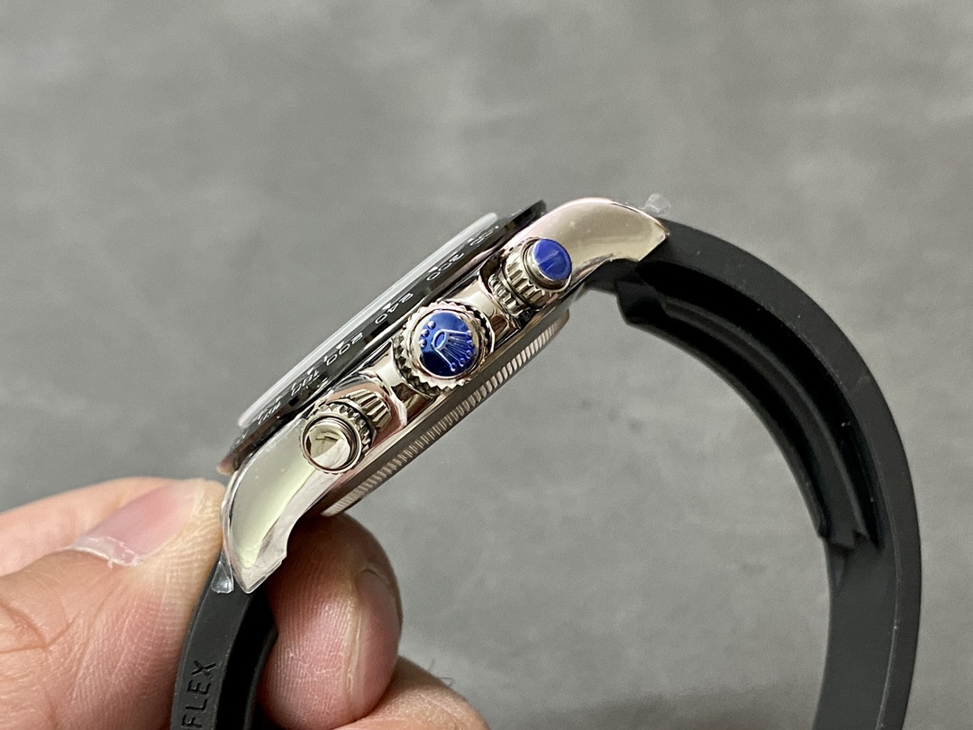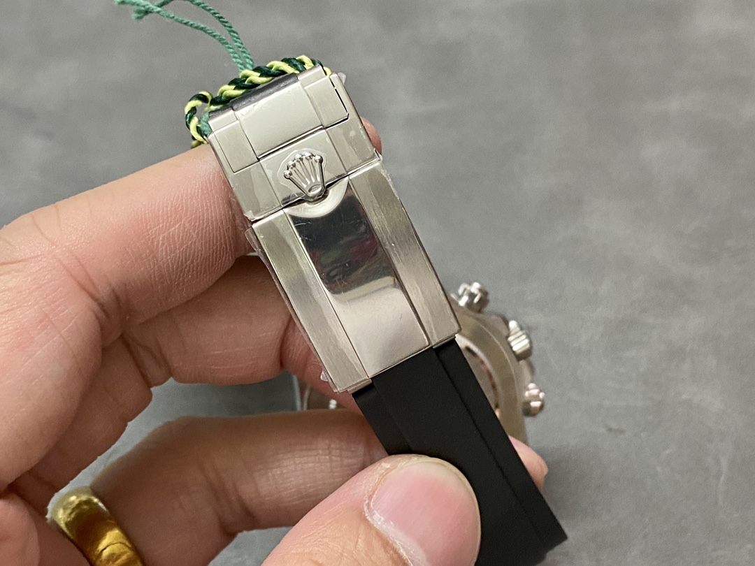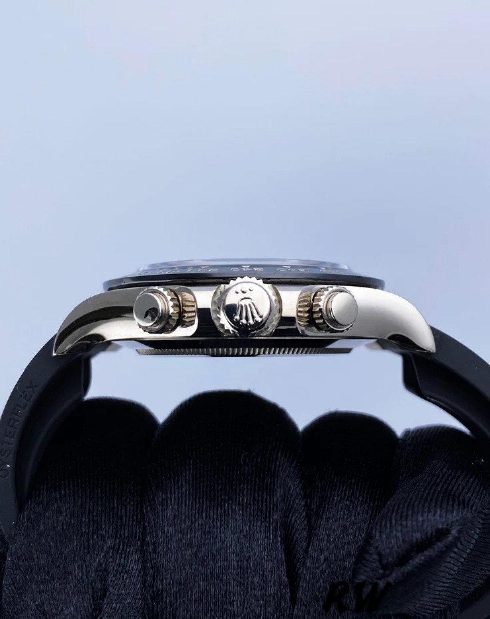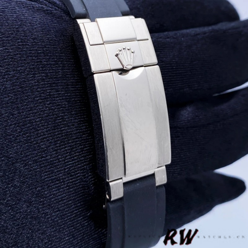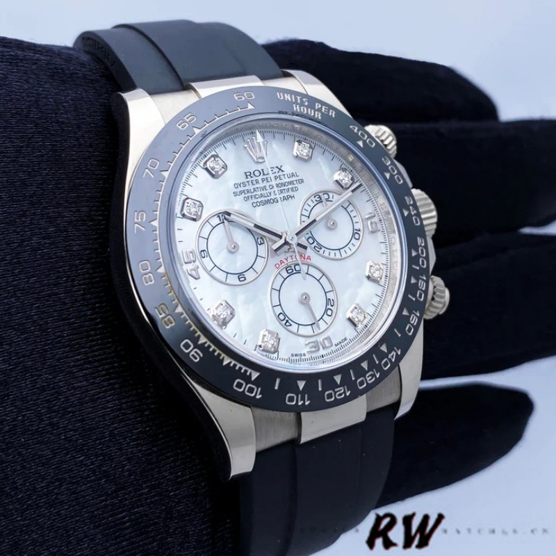 Rolex Cosmograph Daytona 116519 Mother of Pearl Dial 40mm Mens Watch.40mm white gold case. Ceramic tachymeter bezel with black plexiglas insert.The beautiful dial is made with mother-of-pearl and set with diamonds to give a reflective outlook. Three separate sub-dials contained within the center dial with 60 seconds, 30 minutes, and a 12-hour indication are also included.Black rubber Oysterflex strap with fold over clasp with safety. Will fit up to 6-Inch wrist.