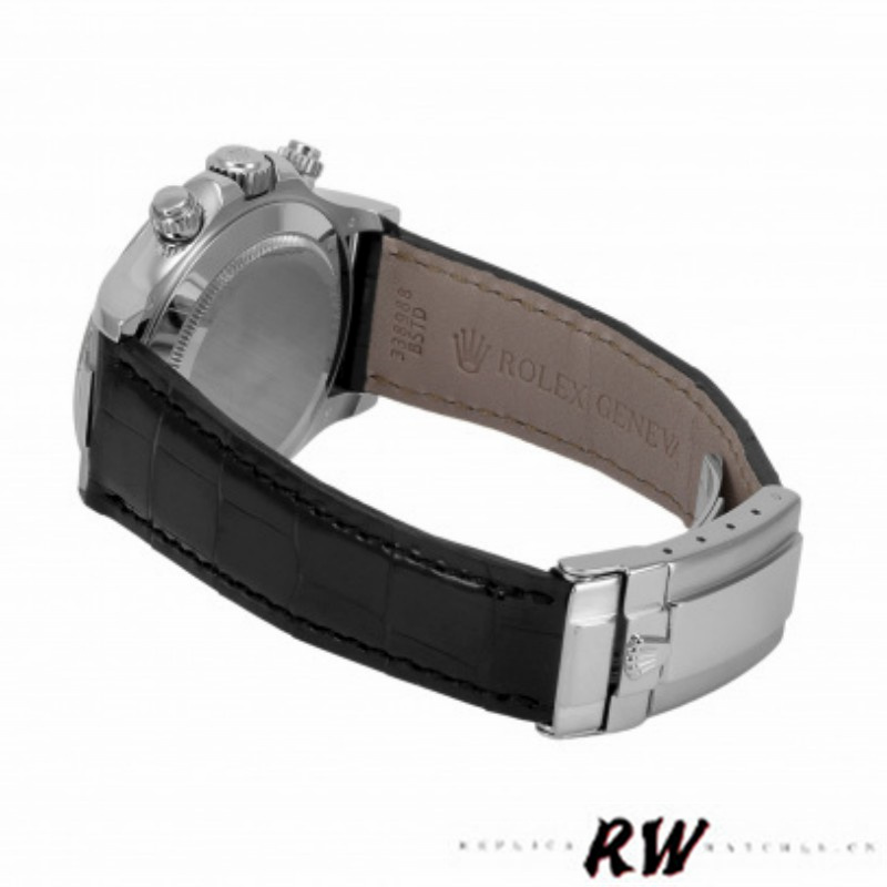 Rolex Cosmograph Daytona 116589 Meteorite Grey Dial 40MM,40MM White Gold Bezel Set With Diamonds,Scratch Resistant Sapphire crystal.Meteorite Grey dial With Roman Numeral hour markers,30-minute counter at 3 o'clock, and 12-hour counter at 9 o'clock,Black Leather Strap With Pattern,Screw Down Crown with Triplock Triple Waterproofness System.
