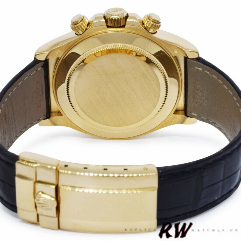 Rolex Daytona 116518 Black Diamond Dial Black Leather strap 40mm Mens Watch features a 40mm yellow gold casesurrounding a black diamond dial . Black Leather strap with an yellow gold deployant buckle. Fixed Tachymeter Engraved Bezel.Functions include hours, minutes, small seconds, chronograph and tachymeter. Scratch Resistant Sapphire Crystal.
