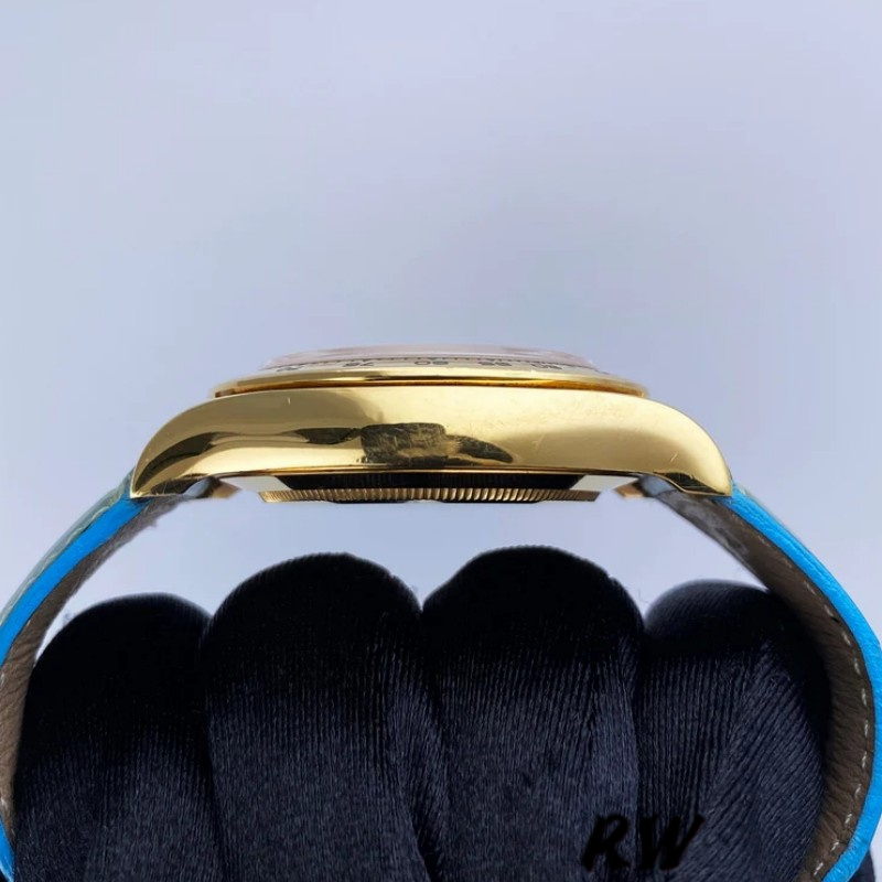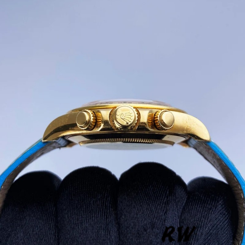 Rolex Daytona 116518 Blue leather strap MOP Dial 40mm Mens Watch. 40mm yellow gold case with yellow gold tachymeter bezel. Mother of pearl dial with gold hands and Roman numeral hour marker. Three sub-dials. Small seconds hand at 6 o'clock. 30-minute counter at 3 o'clock. 12-hour counter at 9 o'clock. Minute maker on the outer dial. Blue leather strap with yellow gold fold over clasp with safety. Will fit up to 6.5-Inch wrist.