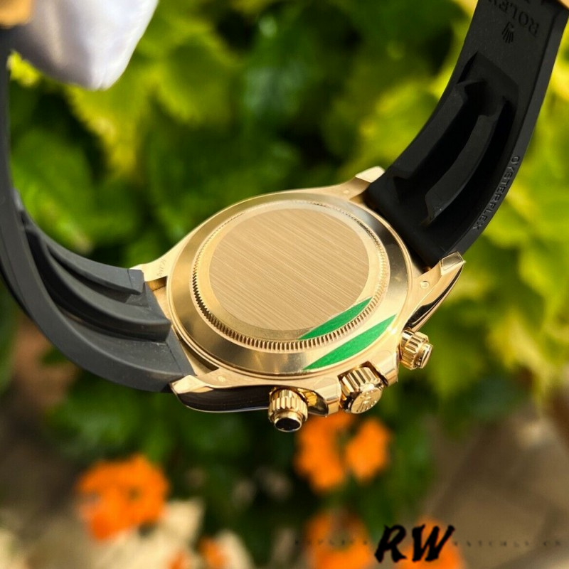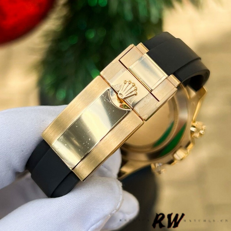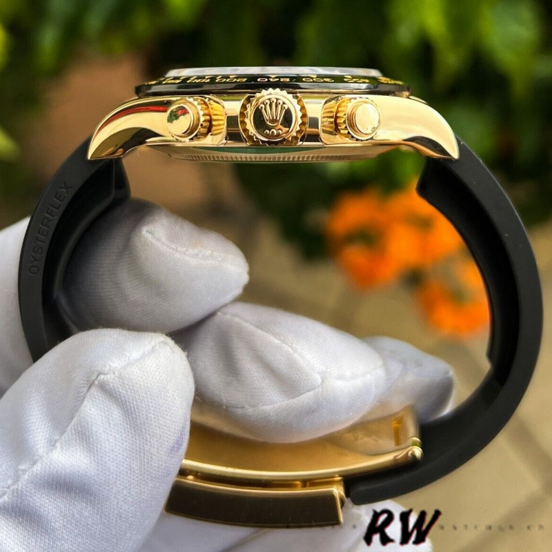 Rolex Daytona 116518LN Black Diamond Dial 40mm Mens Watch.40mm yellow gold case, screw-down yellow gold back, screw-down crown and push buttons with Triplock triple waterproofness, black monobloc Cerachrom bezel with engraved tachymetric scale, scratch-resistant double anti-reflective sapphire crystal, Black dial, 8 diamond hour markers,chronograph central second hand, 30-minute counter at 3 o'clock, and 12-hour counter at 9 o'clock,Black Rubber strap.Oysterlock folding safety buckle.