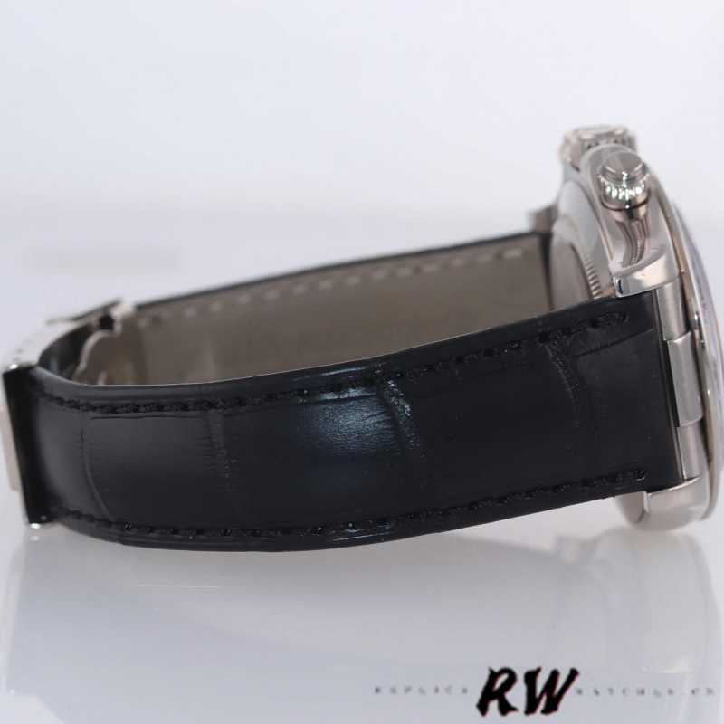 Rolex Daytona 116519 Black Racing Dial Leather strap 40mm Mens Watch. The 40mm white gold case Rolex watch has a Triplock winding crown and two screw-down chronograph pushbuttons. Fixed domed tachymeter bezel and a scratch-resistant sapphire crystal.Black Racing Chronograph Dial with red accents.Black Alligator Strap with White Gold Flip Lock Deployment Clasp.