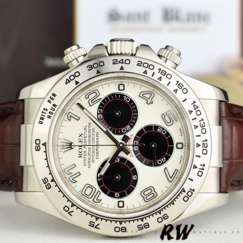 Rolex Daytona 116519 "Panda" Dial Chocolate Leather Strap 40mm Mens Watch has a White Gold 40 mm Round Case.Polished Stainless Steel Tachymeter Bezel.White Dial with Hour, Minute, Very Smooth Sweeping Second Hand, Three Functional Black Sub Dials, Arabic Numerals Hour markers.Chocolate Leather strap with Markings and Engravings and Engraved Clasp.