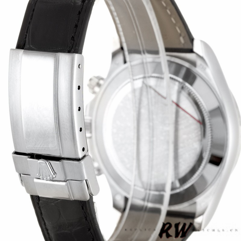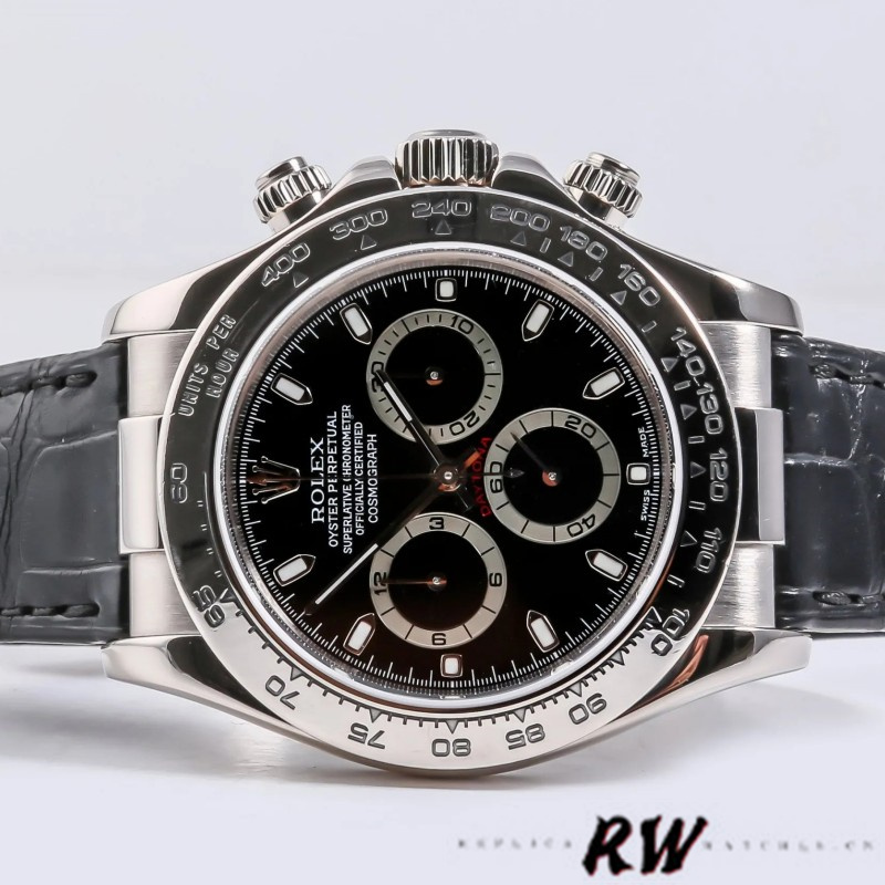 Rolex Daytona 116519 White Gold Black Dial 40mm Mens Watch.40mm Stainless Steel case and bezel.Minute markers around the outer rim. Black dial. Black Leather Strap with deployant clasp. Luminous Index.The bright luminous sticks marked on the dial will light up when you leave the light.The hands of the watch is silver-tone which is pretty cool and fashionable.