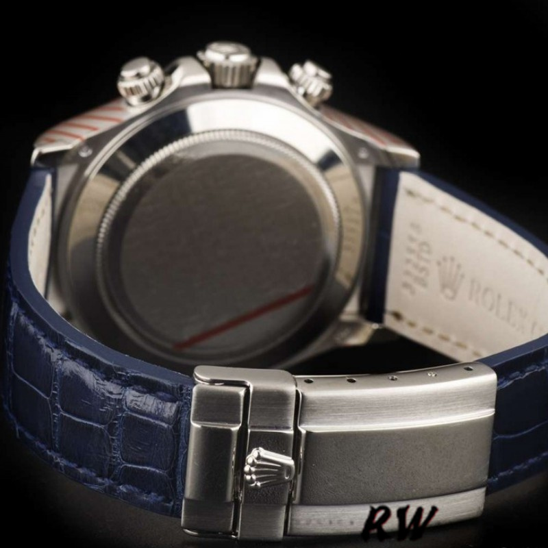 Rolex Daytona 116589BR Sodalite Dial Baguette Diamond Bezel 40mm Mens Watch.40mm White Gold case.rare sodalite dial with 8 applied round brilliant cut diamond hour markers , 30 minute recorder at 3 0'clock, small seconds at 6 0'clock, 12 hour recorder at 9 0'clock, a fixed white gold bezel set with 24 baguette cut sapphires, The sapphire bezel is also perfect.Blue leather strap with a white gold oysterlock deployant clasp, sapphire glass.