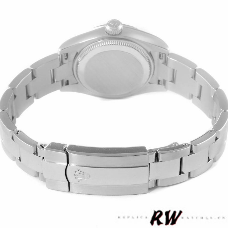 Rolex Oyster Perpetual 176234 Black Roman and Diamond Dial 26MM Lady Watch,26MM Stainless steel oyster case in diameter.White gold fluted bezel. Scratch resistant sapphire crystal. Black dial with roman numerals and diamond hour markers. Stainless steel oyster bracelet with a deployant buckle.