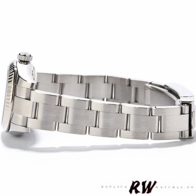 Rolex Oyster Perpetual 176234 White Roman Dial 26mm Lady Watch,26mm Stainless steel oyster case in diameter. White gold fluted bezel. Scratch resistant sapphire crystal. White Dial with Roman Numerals and Diamonds. Minute markers around outer rim. Stainless steel oyster bracelet with a fold over clasp.