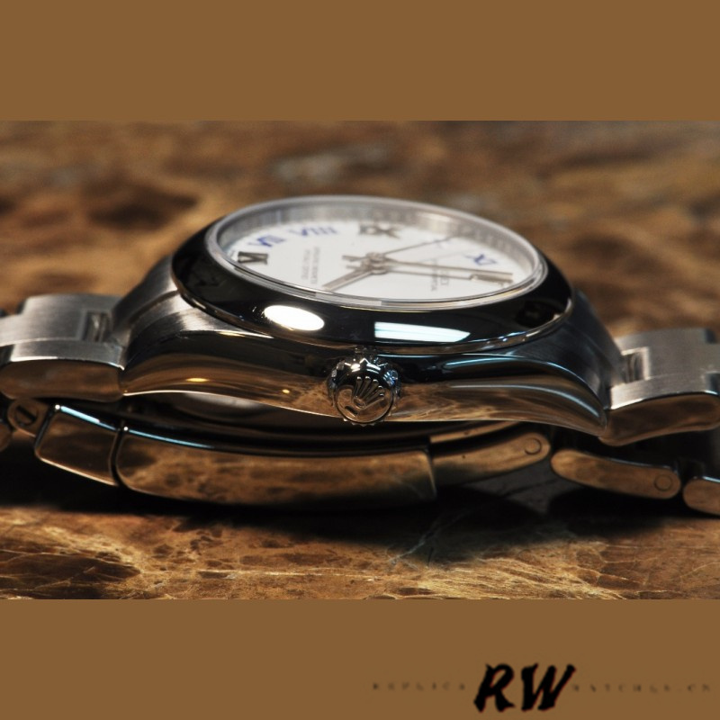 Rolex Oyster Perpetual 177200 White Dial Blue Roman Oyster Bracelet 31mm Lady Watch,31mm Stainless steel oyster case in diameter. Stainless steel smooth domed bezel. Scratch resistant sapphire crystal. White dial with painted blue Roman numerals and applied white gold Roman numerals at III, VI, and IX. Stainless steel oyster bracelet with a fold over clasp.