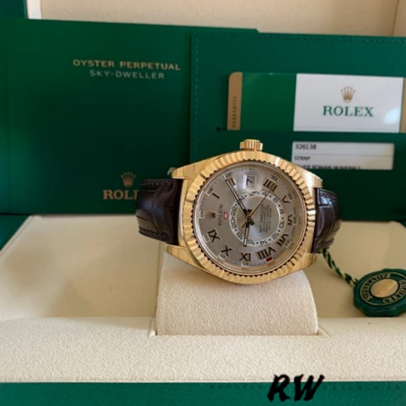 Rolex Sky-Dweller 326138 Sunray Silver Dial Yellow Gold 42MM Mens Watch ,42mm yellow gold case, bidirectional rotatable ring command fluted bezel , Sunray Silver dial with Roman Numeral Hour Markers.Second time-zone displayed via off-center rotating disc, Saros annual calendar with date at 3 o'clock and month indicated in discrete apertures at each of the 12 hour marks, Alligator leather strap with Yellow gold folding Oysterclasp.