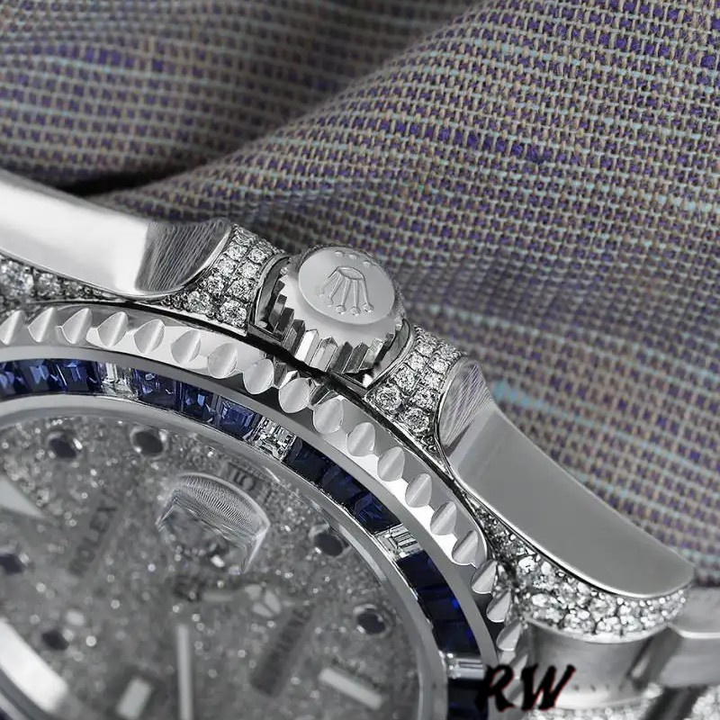 Rolex Submariner Date 116610LN Stainless Steel Diamond Bezel 40MM Mens Watch, 40mm Stainless Steel Case, Lugs Set with Round Brilliant Cut Diamonds. The watch features a custom diamond-set bezel, custom diamond dial with blue indexes, digital date window with magnified bubble at 3 o'clock, sapphire crystal, Stainless steel Oyster diamond bracelet with folding Oyster safety clasp.